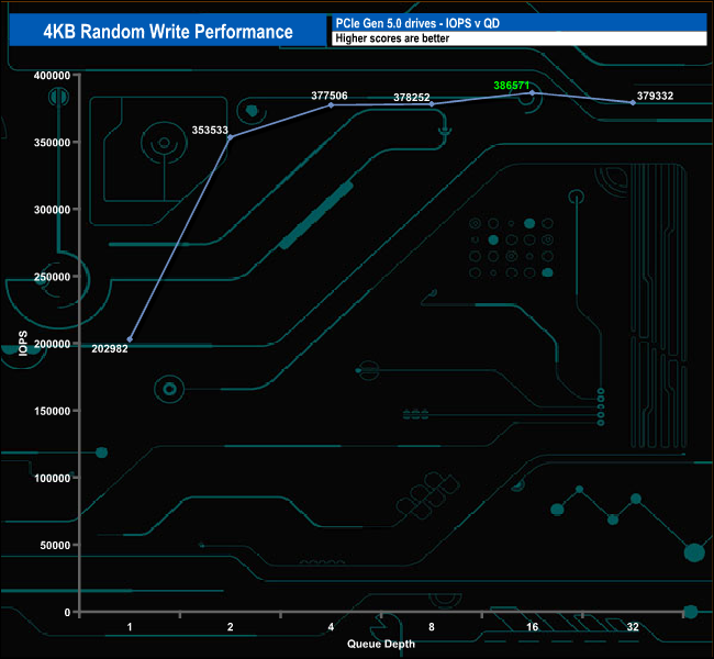 The best result we saw from our 4K random write results was even further away from the official maximum IOPS figure (2,200,000 IOPS) than the random reads at 386,571 IOPS (QD16). The drive finished the test run at 379,332 IOPS (QD32).