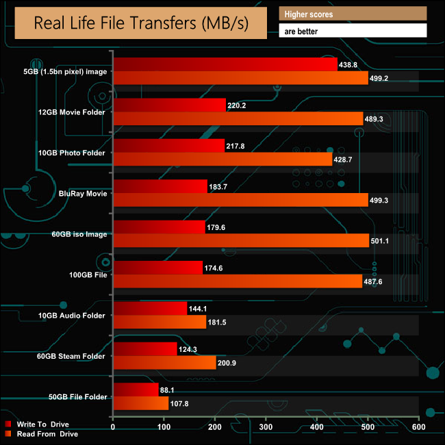 The drive had no problems dealing with our real life file transfer tests although the read performance was much stronger than the write throughout the test.
