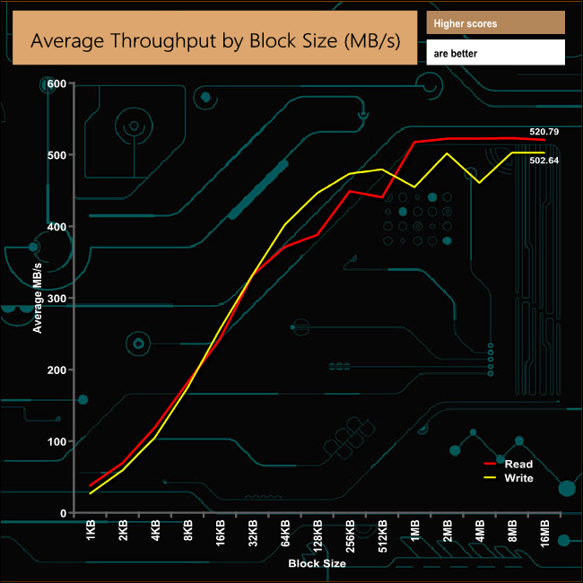 In our throughput test the drive peaked at 523.21MB/s (8MB block) during the read test before dropping back to finish the run at 520.79MB/s, both of these figures being faster than the official 480MB/s.