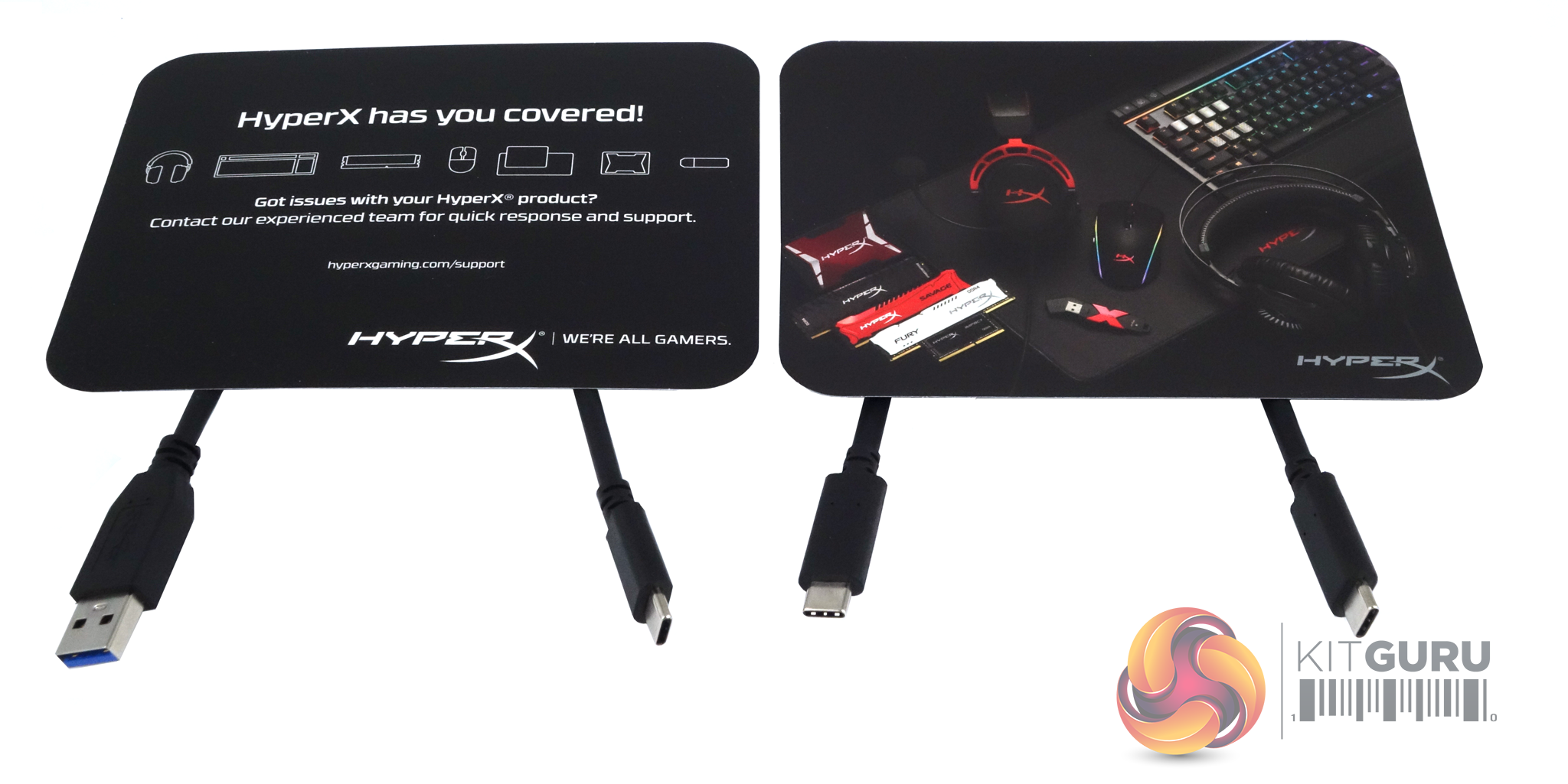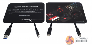 The box bundle comprises USB Type C to A and USB Type C to C cables and a couple of HyperX marketing cards. One has images of all the types of products that make up the HyperX family with a welcome message on the back while the other card has a multilingual message where to get support for the drive.