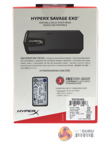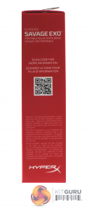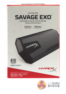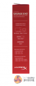 The Savage EXO ships in a sturdy compact box with an image of the drive on the front, along with sequential read and write speeds and information stating that it uses 3D NAND and a USB 3.1 Gen 2 interface. In the bottom left hand side of the box is a panel displaying the drives compatibility with Windows, Mac, Linux, Xbox One and PS4.