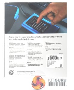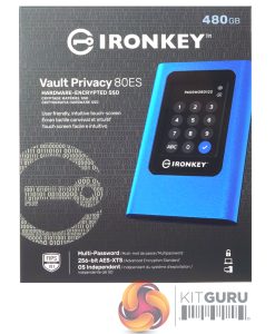 The IronKey Vault Privacy 80 ES comes in a largish box with a good clear image of the drive on the front. The background of the front of the box is covered in binary code with the IronKey logo picked out in a lighter colour. Right at the top of the box is a label showing the capacity of the drive while. under the drive. are displayed three of the drives features; Multi-Password, 256-bit AES-KTS encryption and OS independent.