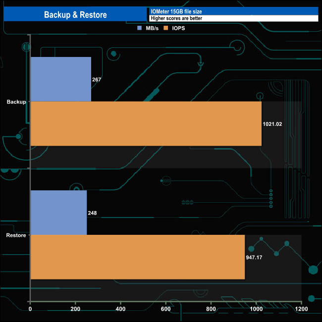 We set IOmeter up (as shown above) to test both backup and restore performance on a 100GB file.