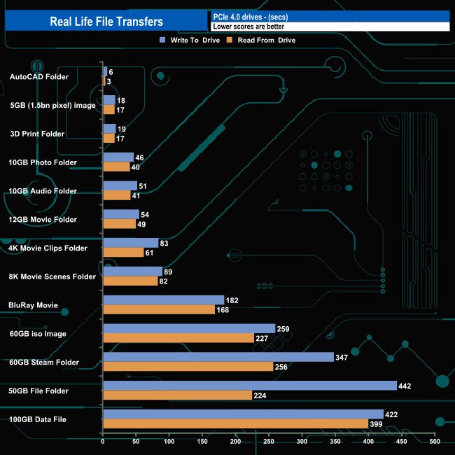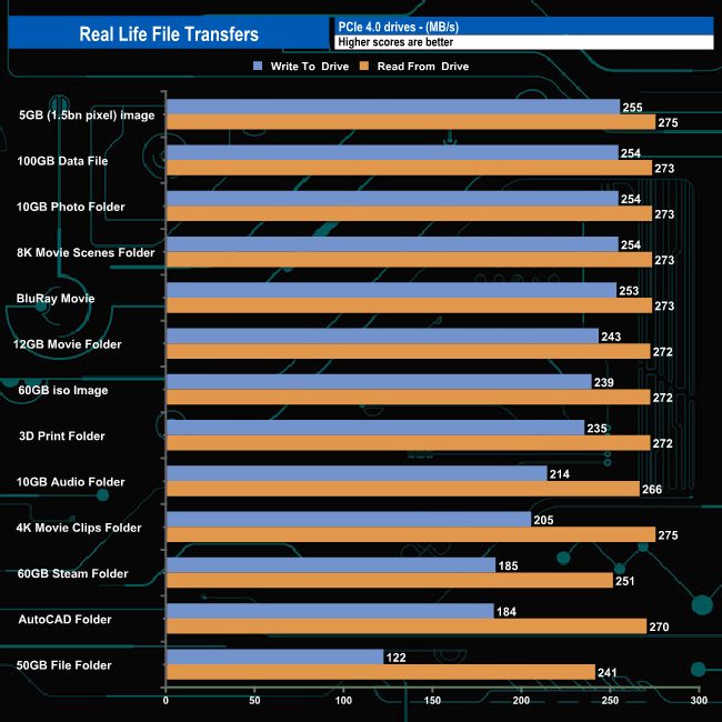 To test the real-life performance of a drive we use a mix of folder/file types and by using the FastCopy utility (which gives a time as well as MB/s result) we record the performance of drive reading from & writing to a 256GB Samsung SSD850 PRO.