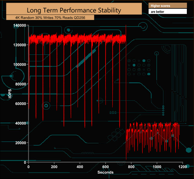 For the long term performance stability test, we set the drive up to run a 20-minute 4K random test with a 30% write, 70% read split, at a Queue Depth of 256 over the entire disk. The 960GB KC1000 averaged 92,658 IOPS for the test with a performance stability of 71%.