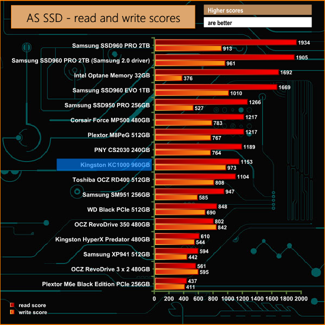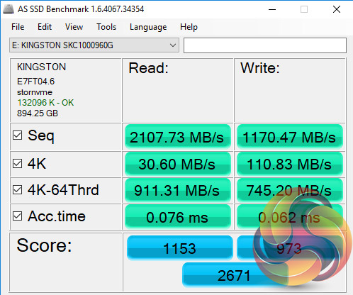 While it's AS SSD read score of 1153 puts it around half way on our list of drives tested, the 973 write score of the KC1000 is the second fastest we have seen to date, behind Samsung's SSD960 EVO.