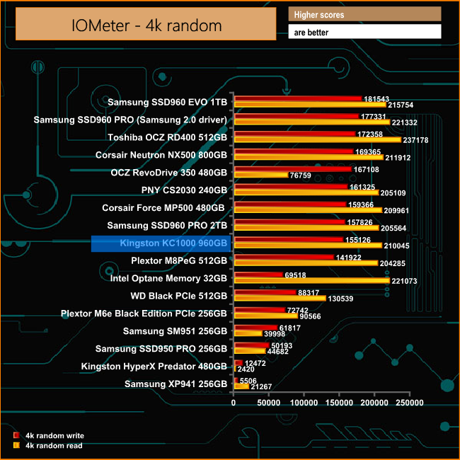 Its swings and roundabouts with the random 4K figures. Under test the drive produced 155,126 IOPS for writes which is down on the official 165,000 IOPS. On the other hand the read figure of 210,045 IOPS surpassed the official 190,000 IOPS rated figure.