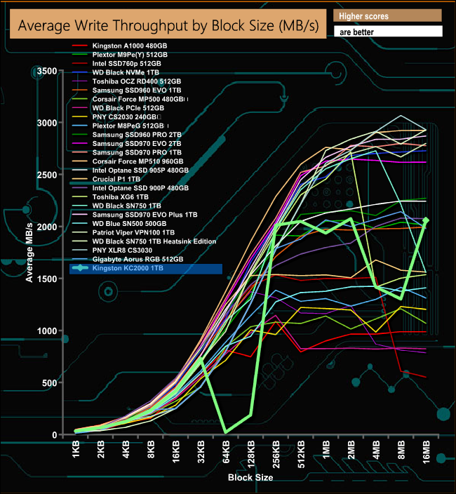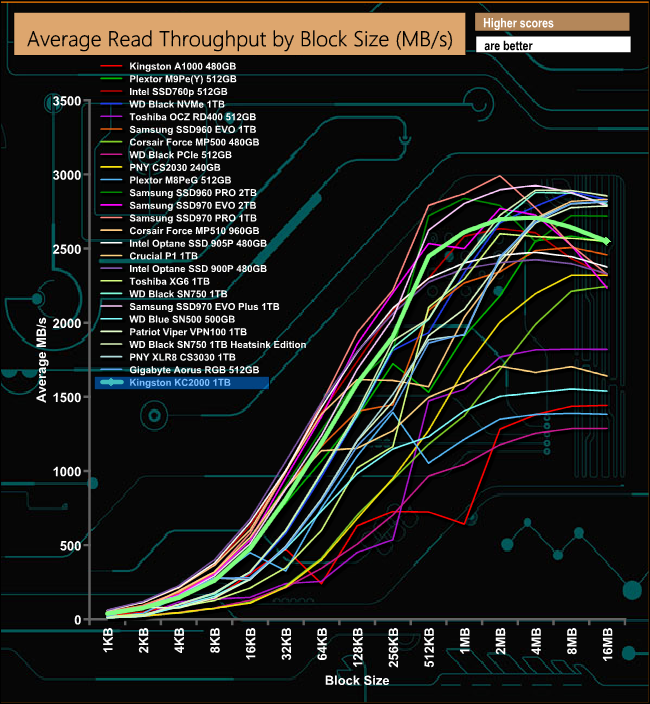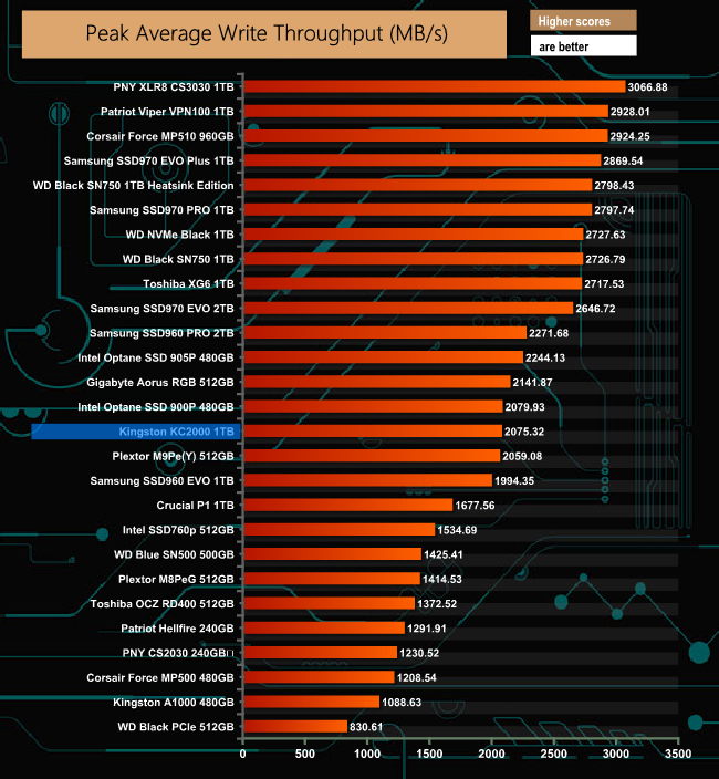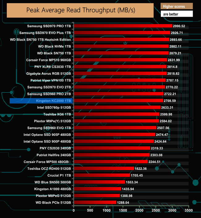 That 2,708.59MB/s read throughput performance places the KC2000 in the mid-point on our results table.