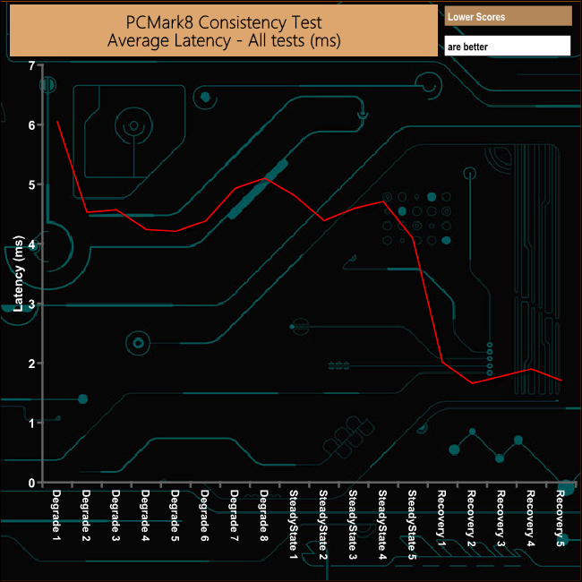 The KC2000 handles the rigours of PCMark 8's Consistency Test rather well. There are no major drops performance as the test progresses although the drives recovery isn't exactly consistent,