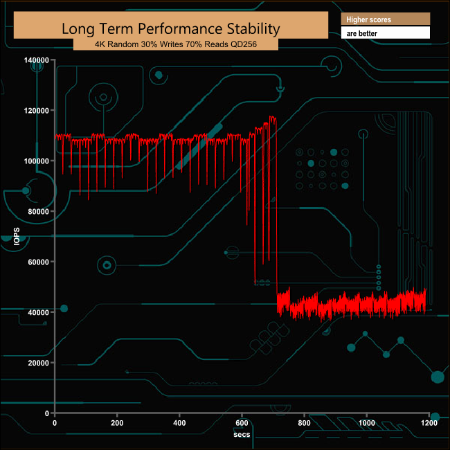 For the long term performance stability test, we set the drive up to run a 20-minute 4K random test with a 30% write, 70% read split, at a Queue Depth of 256 over the entire disk. The 1TB KC2000 averaged 82,149 IOPS for the test with a performance stability of 70.16%, which is what you would expect for a drive aimed at business users as well as the consumer segment.