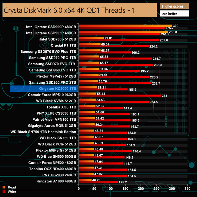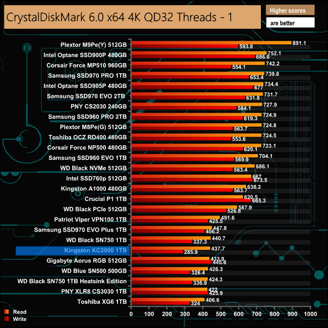 At a deep queue depth of 32, Kingston's KC2000 has faster read performance than the Toshiba XG6, the only other drive in this list using 96-Layer 3D NAND. However the Toshiba drive has the advantage when it comes to writes.