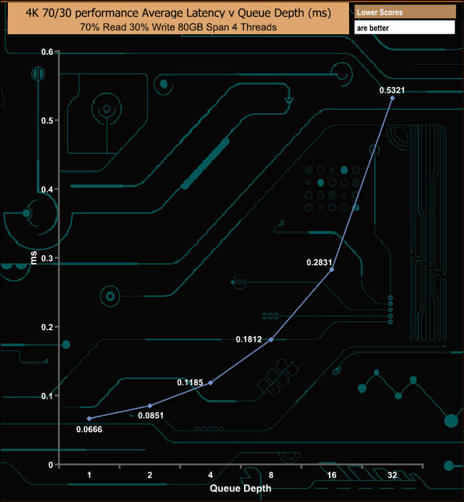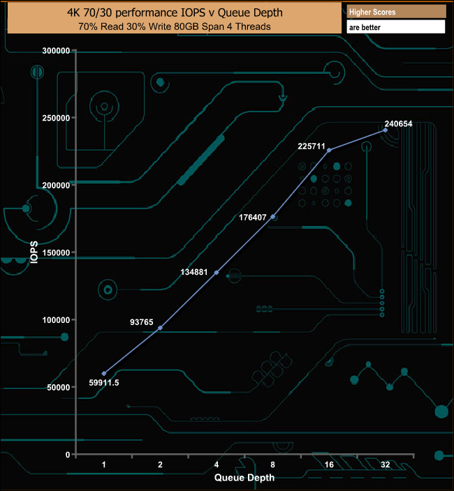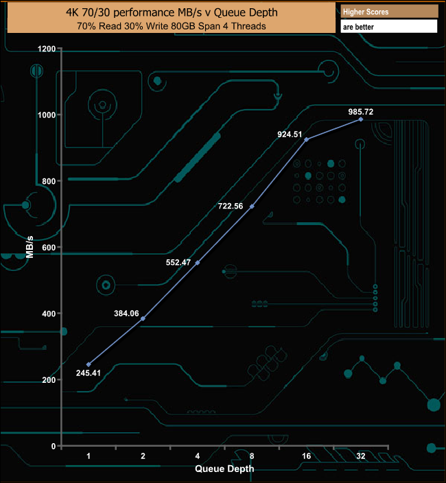 The drive performs well in our 70/30 read/write mix test with the performance climbing cleanly as the queue depth deepens.