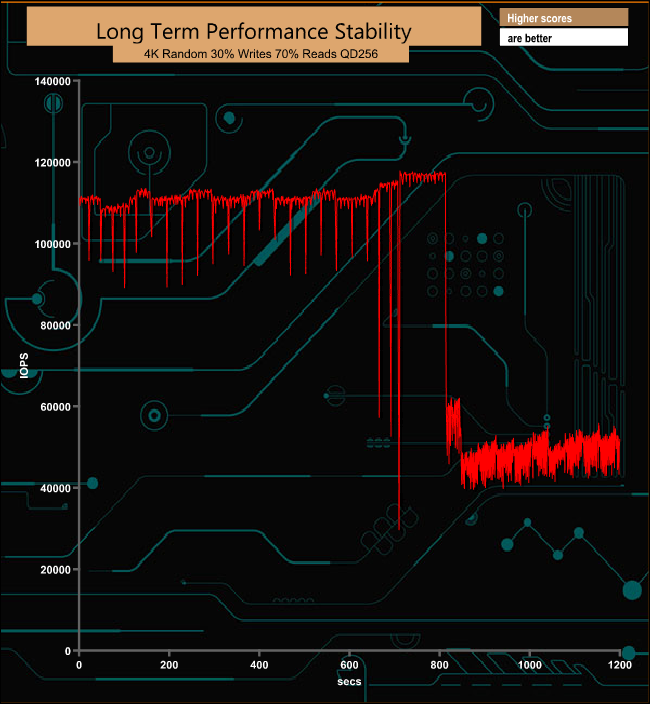 For the long term performance stability test, we set the drive up to run a 20-minute 4K random test with a 30% write, 70% read split, at a Queue Depth of 256 over the entire disk. The 1TB KC2500 averaged 91,166 IOPS for the test with a performance stability of 77%.