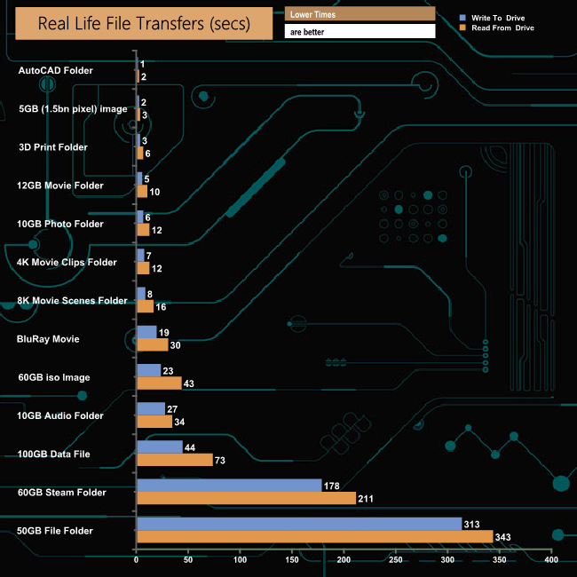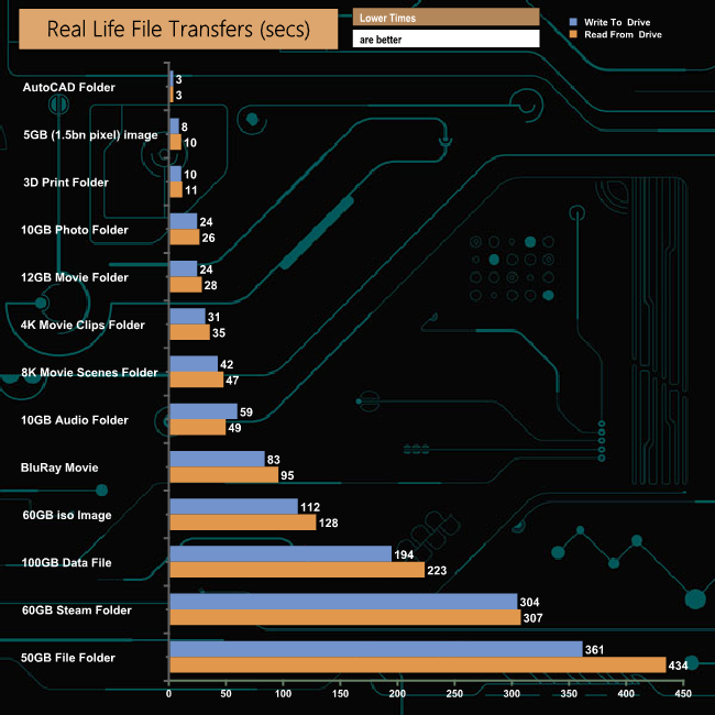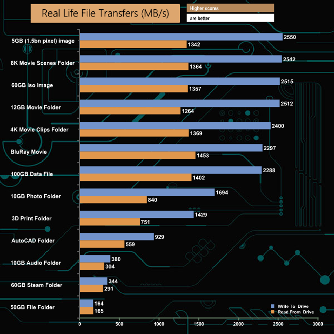 Switching over to the NVMe drive to transfer data to and from the KC2500 saw transfer speeds rocket. Seven of the transfers topped well over 2GB/s while two more topped 1GB/s.
