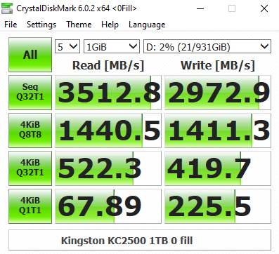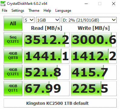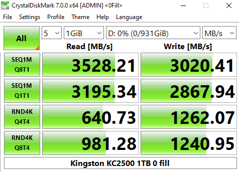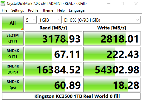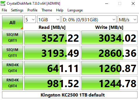 At a deep queue depth of 32, Kingston’s KC2500 sees improvements in performance for both reads and writes over the previous KC2000 drive. Looking at the two CrystalDiskMark result screens it appears that the controller doesn't have a preference for the type of data it's being asked to work with.