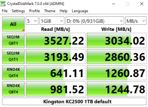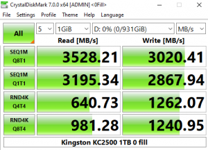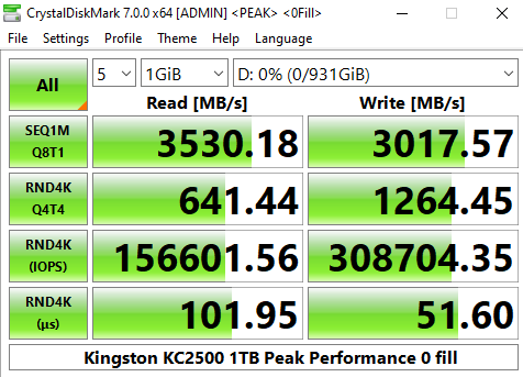 Looking at the Peak Performance results for Sequential read/write performance we could confirm the official Sequential read/write figures of up to 3,500MB/s and 2,900MB/s respectively with the review drive showing reads at 3,527MB/s and 3,009MB/s for writes under testing.