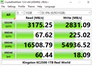 The latest version of CrystalDiskMark, version 7, includes a couple of profiles that can be used for testing – Peak Performance and Real World. The result screens for these two profiles not only display MB/s results but also IOPS and latency.