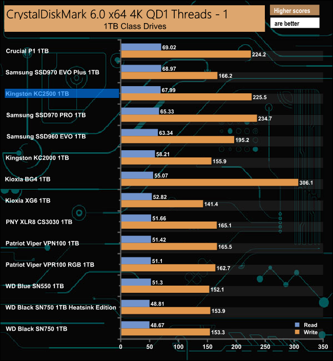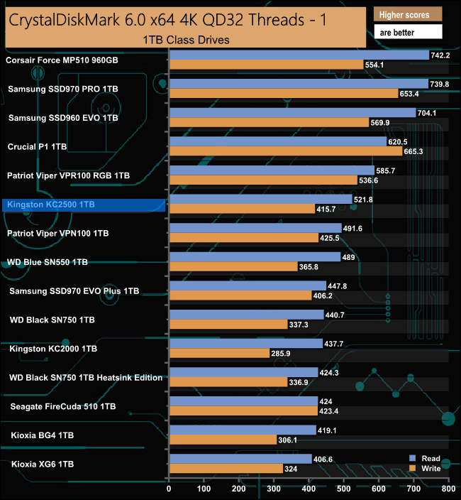 At a shallower QD of 1, the KC2500 sees a very small improvement in read performance over the previous KC2000 drive, however, the improvement in write performance is much more impressive.