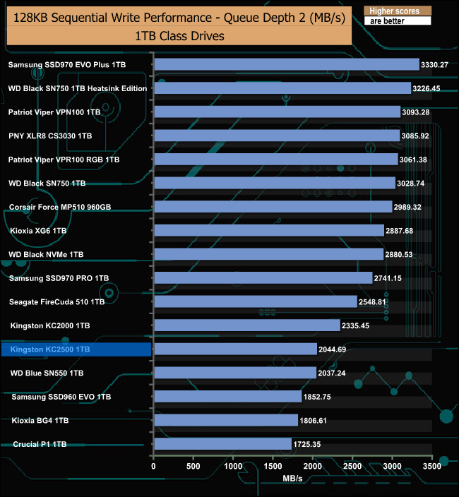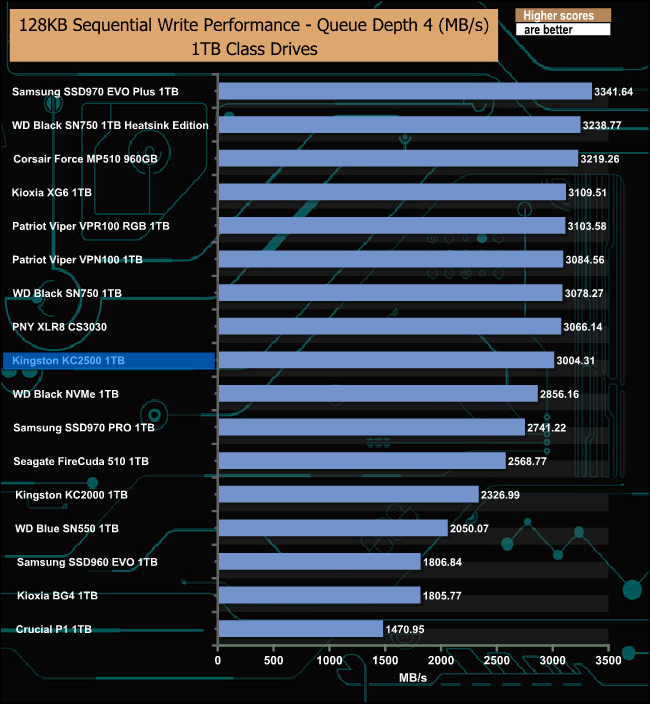 The KC2500 performs very strongly throughout the tested queue depths, at QD2 it's the fastest 1TB class M.2 consumer drive we've tested to date.