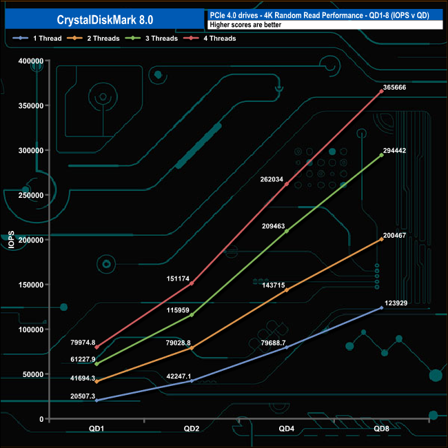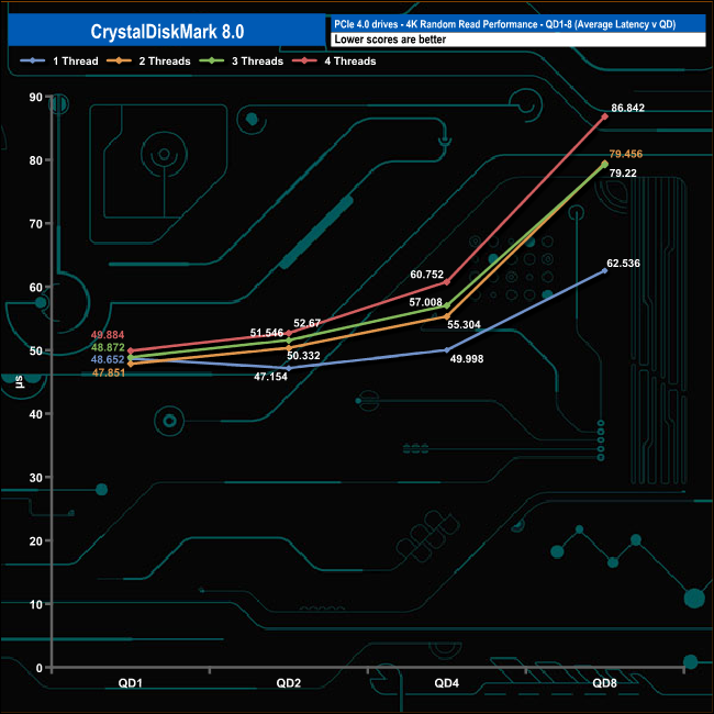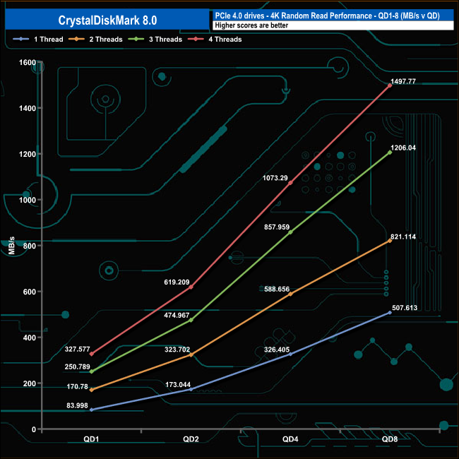 We used CrystalDiskMark 8 to test the random performance of the drive at lower queue depths (QD1 – QD8 where most of the everyday workloads occur) using 1 to 4 threads.