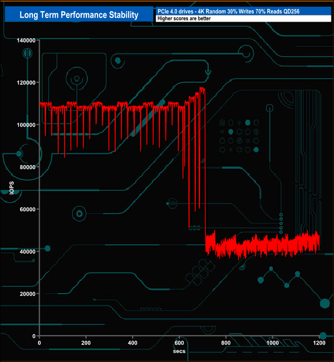 For the long term performance stability test, we set the drive up to run a 20-minute 4K random test with a 30% write, 70% read split, at a Queue Depth of 256 over the entire disk. The 2TB Kingston KC3000 averaged 81,845 IOPS for the test with a performance stability of 70%.