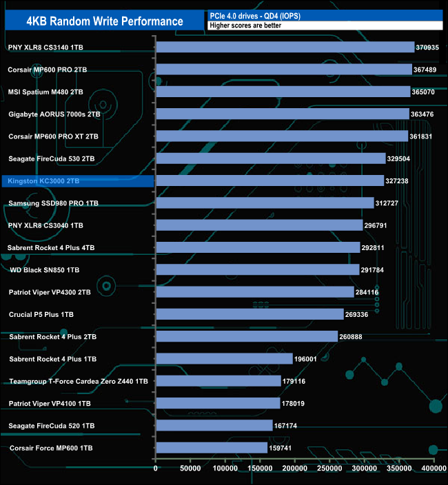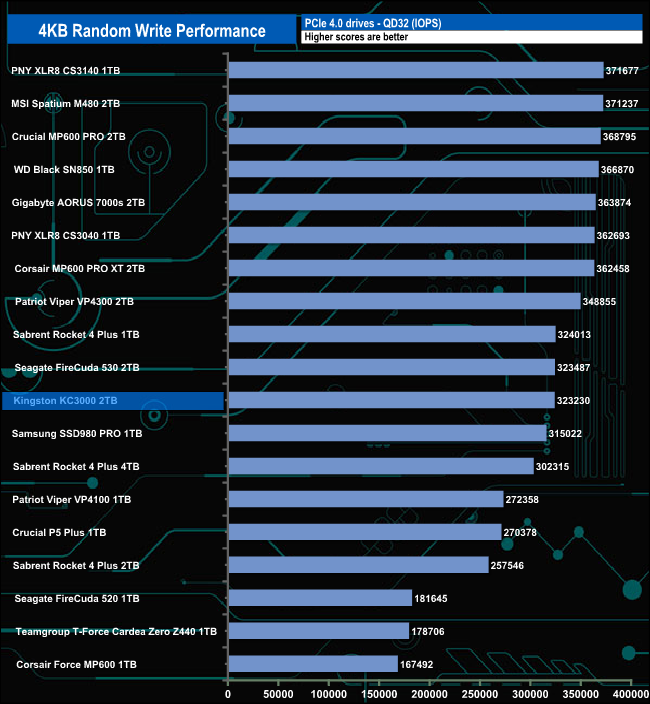 As with the 4K random read testing, with our 4-threaded random write testing, we couldn't get close to the official maximum of 1,000,000 IOPS. The best we saw was 328,795 IOPS at a QD of 16. The performance slipped back at the end of the test run (QD32) finishing at 323,230 IOPS.
