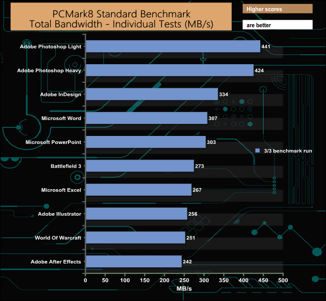 Just like the Consistency test, PCMark 8’s Standard Storage test also saves a large amount of performance data. The default test runs through the test suite of 10 applications three times. Here we show the total bandwidth performance for each of the individual test suites for the third and final benchmark run.