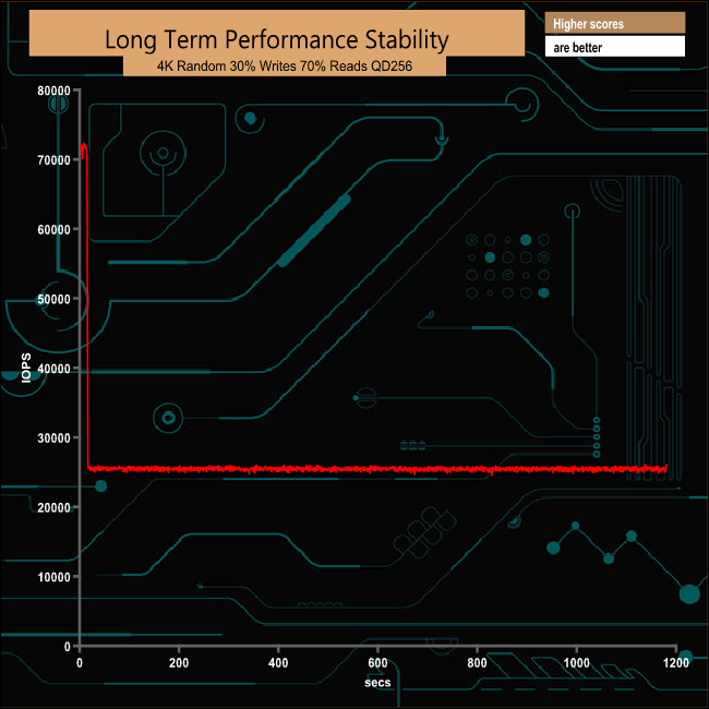For the long term performance stability test, we set the drive up to run a 20-minute 4K random test with a 30% write, 70% read split, at a Queue Depth of 256 over the entire disk. The 1TB Kingston KC600 averaged 26,087 IOPS for the test with a performance stability of 37%.