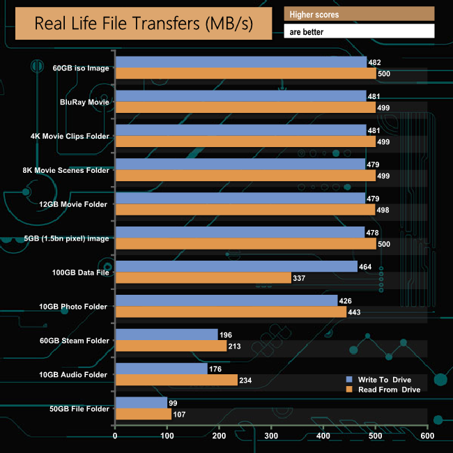The KC600 had no problems dealing with our real-life file transfers, although the 99MB/s when writing the contents of the 50GB file folder to the drive is a little on the low side.