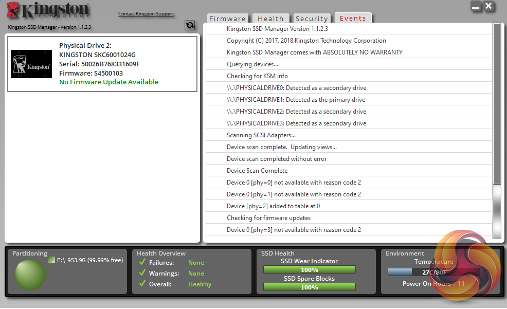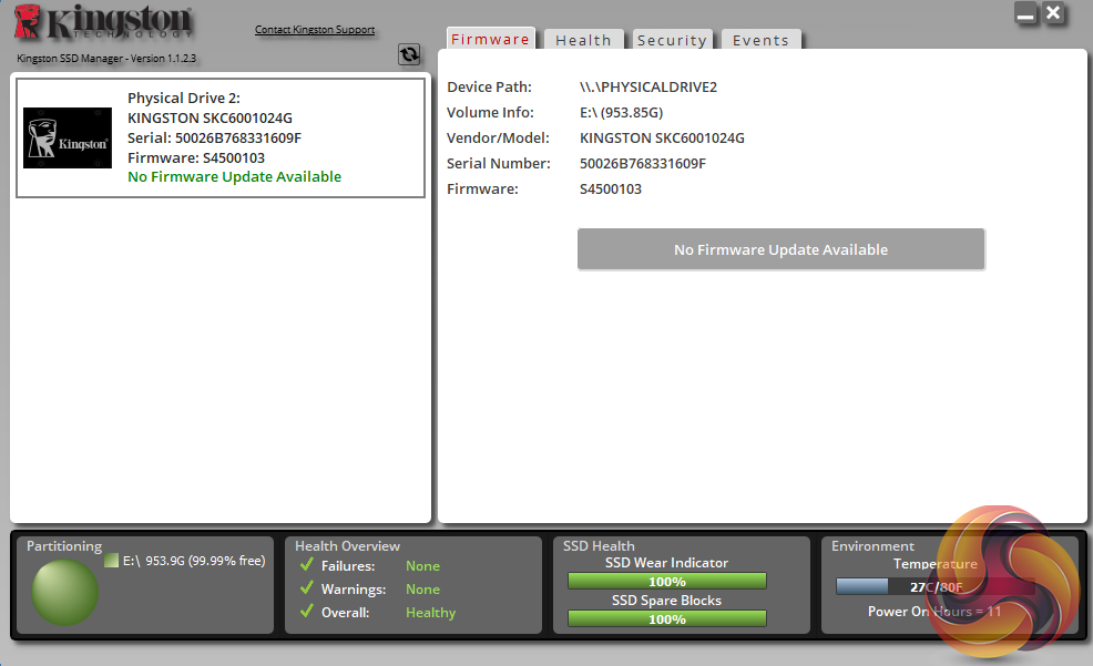 Kingston’s SSD management software utility is simply called SSD Manager. With it, you can monitor the health of the drive and how it’s being used, check the drive’s SMART data and update the firmware as well as securely erasing the drive. You can also manage the security aspects of the drive.