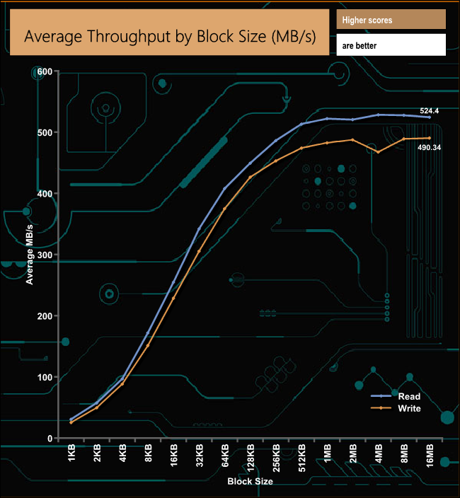 In our throughput test, the reads peaked at the 4MB block mark at 528MB/s while writes peaked at the end of the test at 490.34MB/s, both short of the official maximums of 550MB/s and 520MB/s for read and writes respectively.