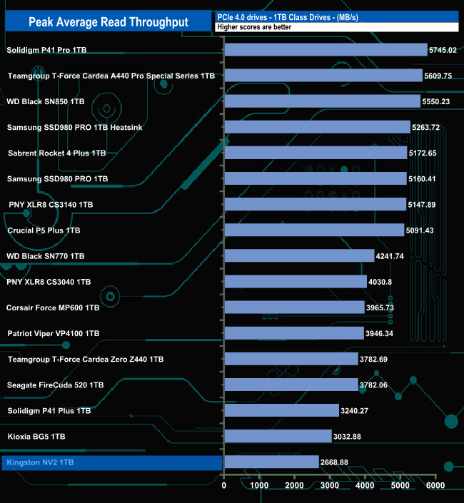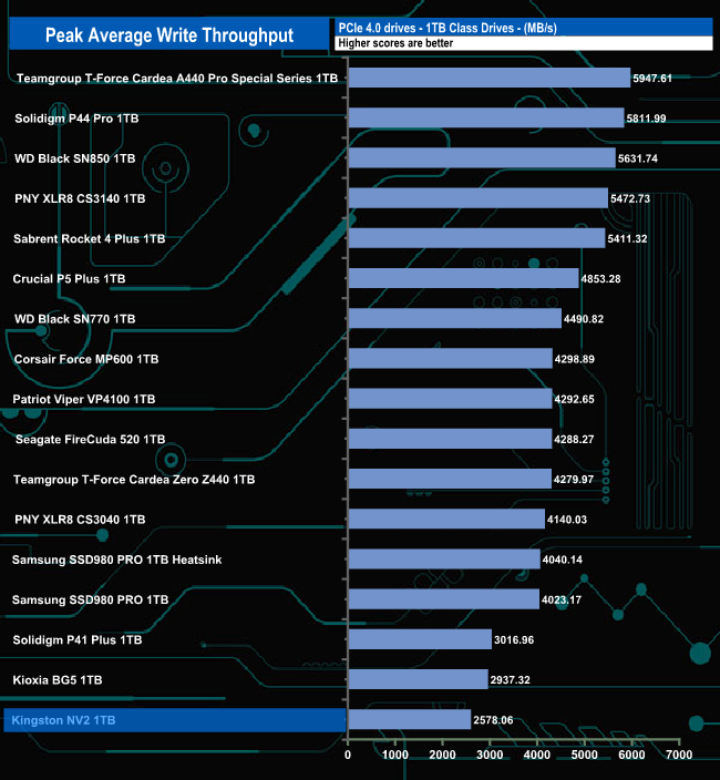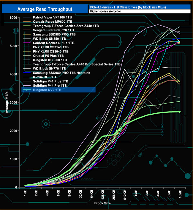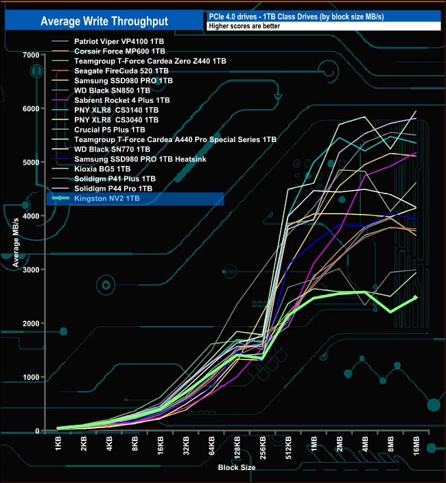 The 1TB NV2 drive is the slowest we've seen in our throughput test by quite some margin.