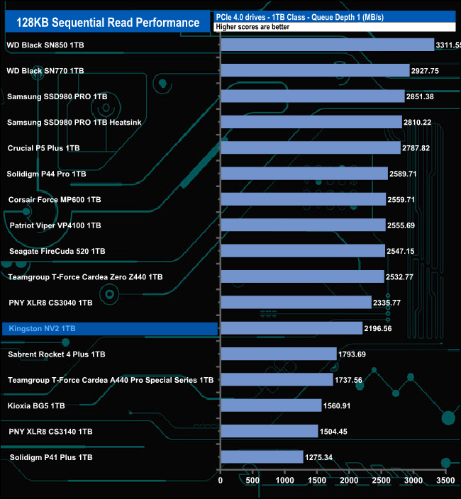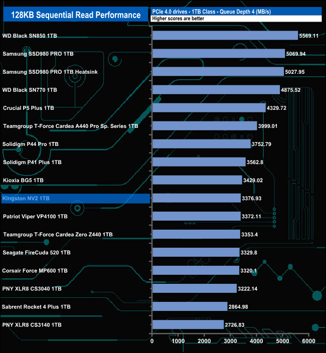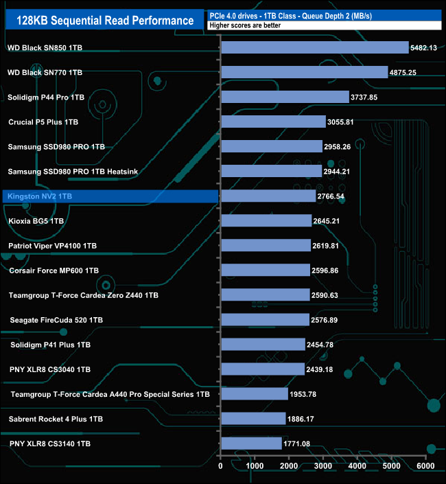 The NV2's best performance in the queue depth tests came at QD2 where its result of 2,766MB/s puts it in the top half of the 1TB class consumer drives we've tested to date. As the QD deepens the drive slips down the chart.