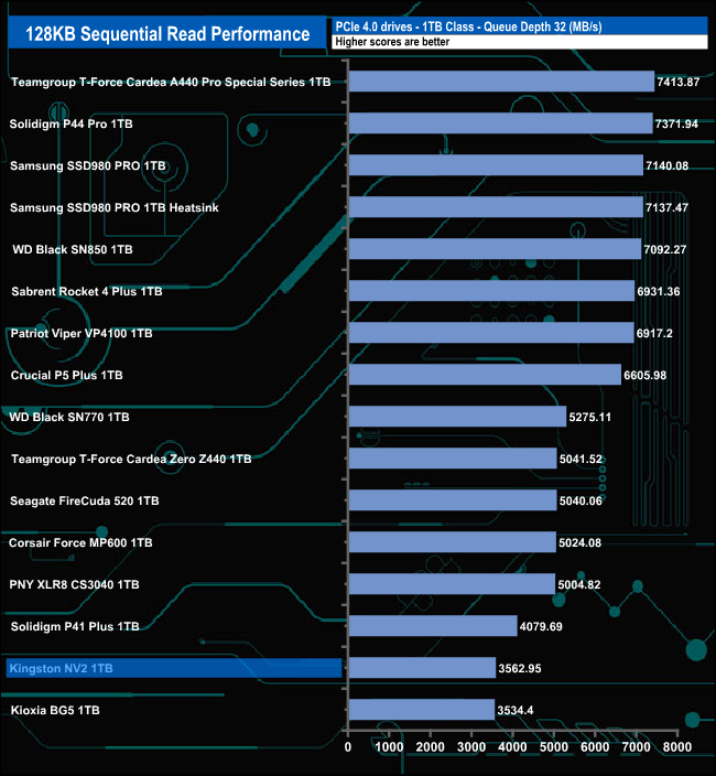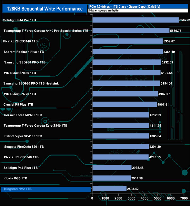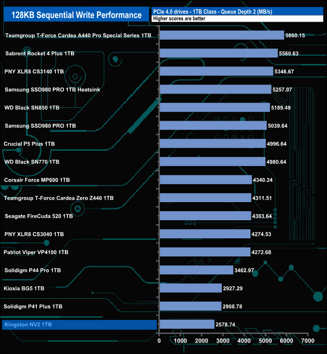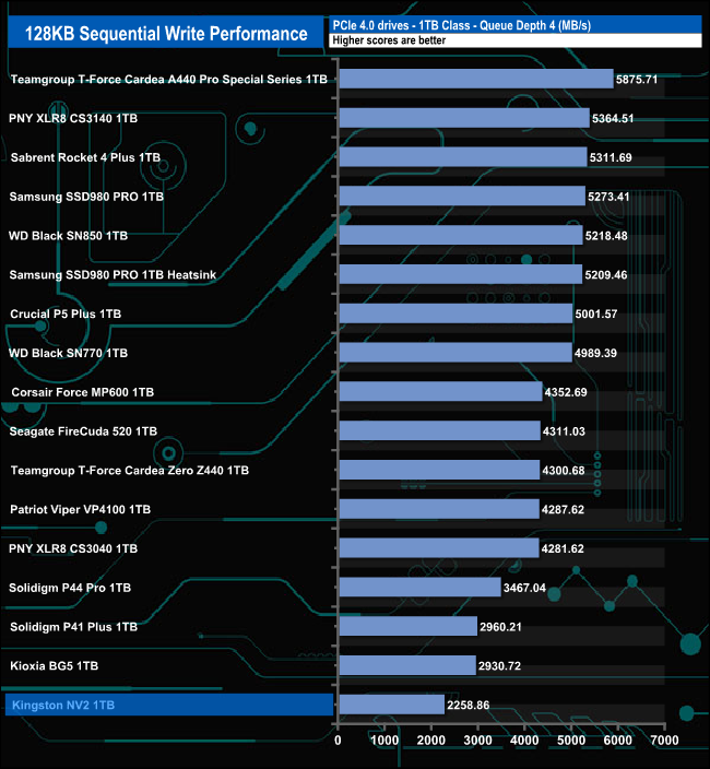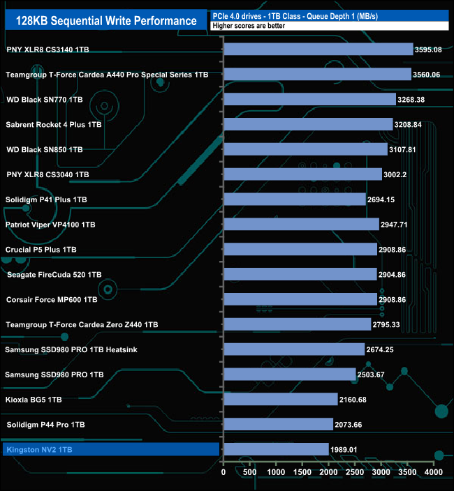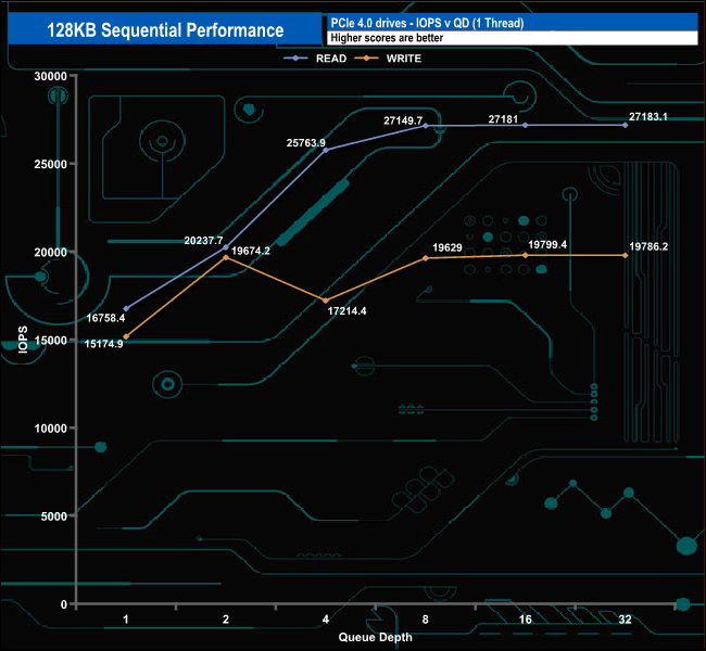 In comparison to the Sequential read QD results when it comes to Sequential writes, the drive stays firmly on the bottom of the performance graph through all the tested queue depths.