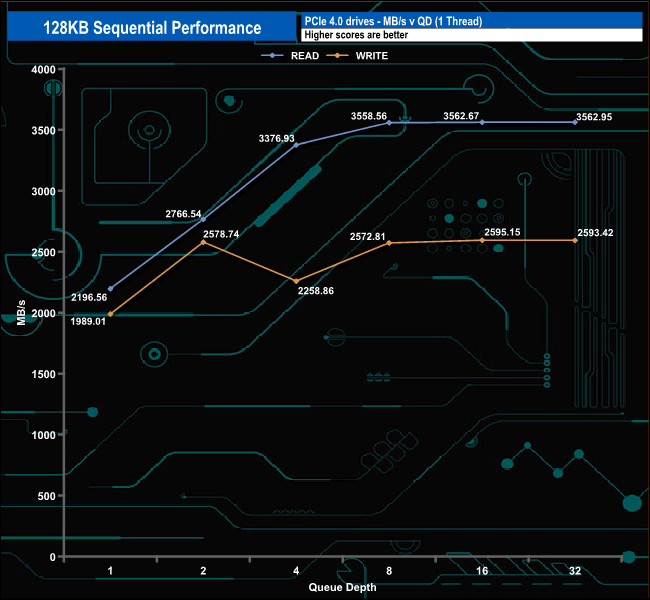When it came to Sequential read performance, the drive's performance levelled off at QD8 finishing the test run at QD32 just 4MB/s faster at 3,562MB/s, which confirms the official maximum speed rating of 3,500MB/s.
