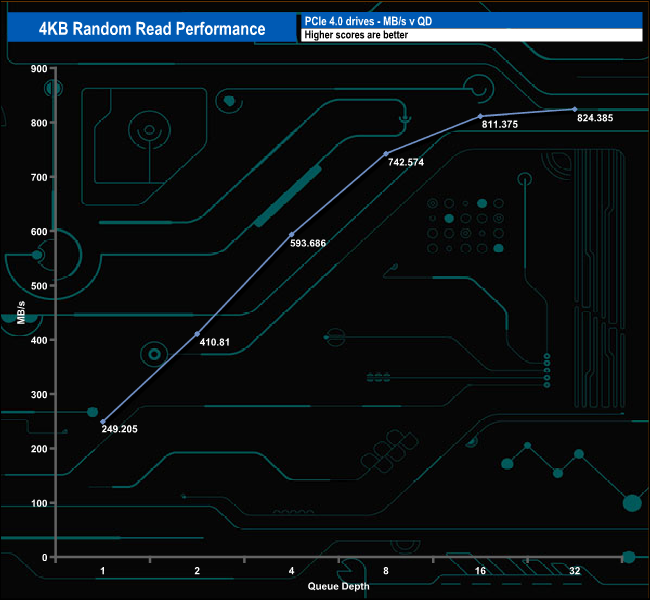 We used CrystalDiskMark 8‘s custom settings to test the 4K random read performance of the drive through a range of queue depths. The setup for the tests is listed below.