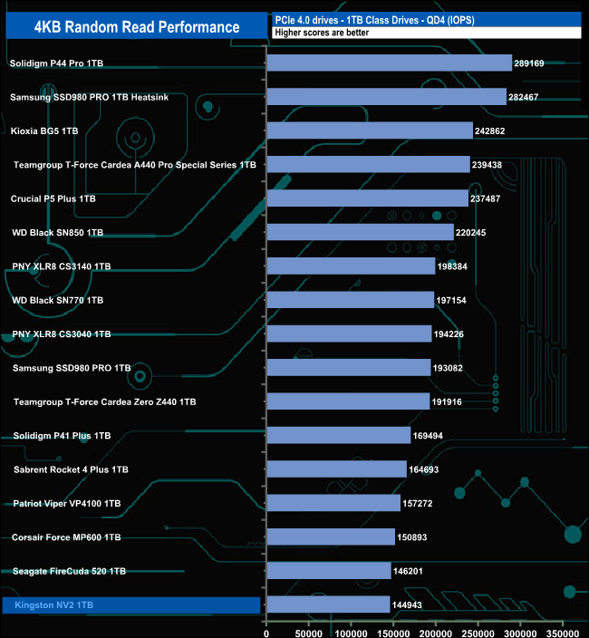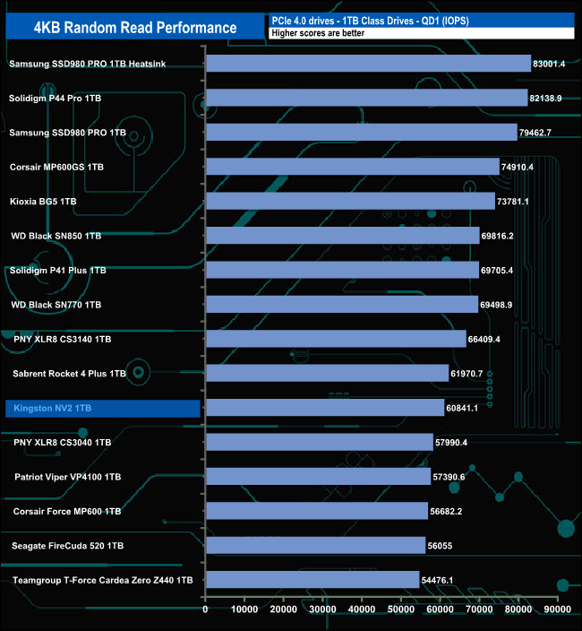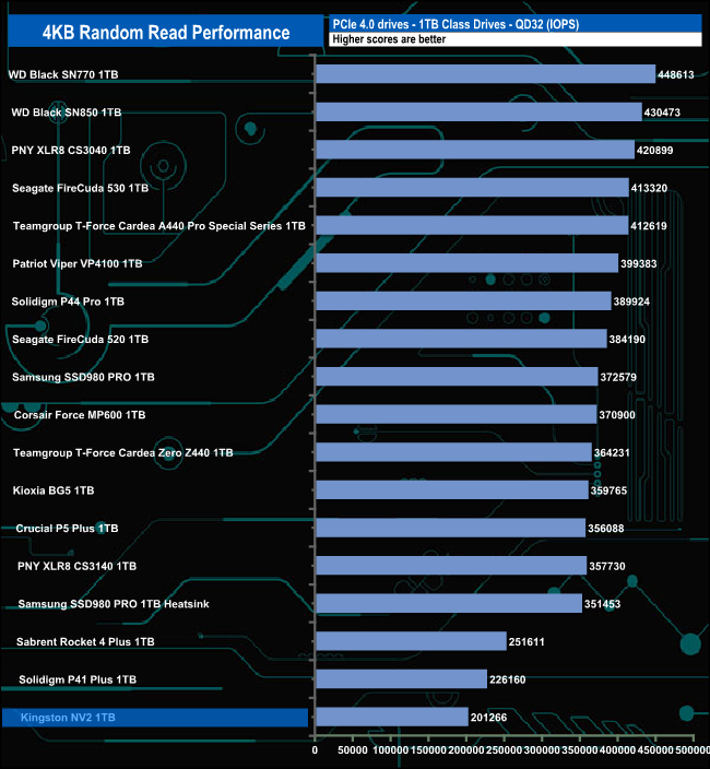 Kingston doesn't provide any random performance figures on the specification sheet for the NV2. Using our 4-threaded tests, the best performance figure we saw for random reads was 201,266 IOPS (824.385MB/s) at QD32.