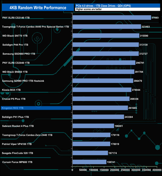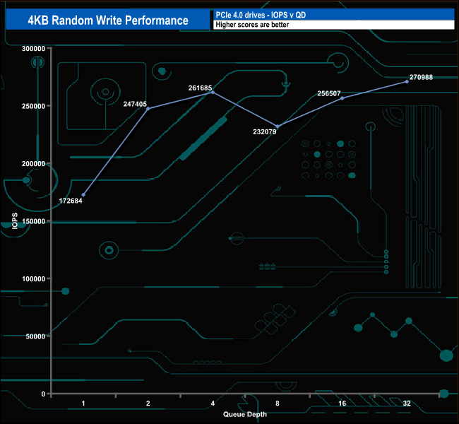 When it came to random writes, the best figure we saw came at QD32 at 270,988 IOPS (1,109.97MB/s). At QD8 the performance drops off (232,079 IOPS) but recovers back by QD16.