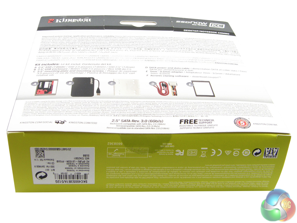 The SSDNow KC400 is available as a bare drive or as part of a full-blown upgrade kit, which is what we were sent for review. The upgrade kit comes in a rather large box with an image of the drive and a clear label of the drive's capacity.