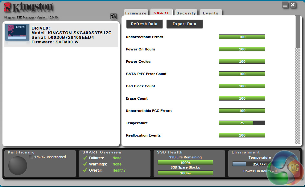 Kingston's SSD management software is called SSD Manager and while at first glance it doesn't look as intricate as Samsung's Magician software, for example, it does cover most of the basics. It displays drive partition information, a SMART overview, SSD Health (including how many spare blocks there are) and the temperature of the drive.