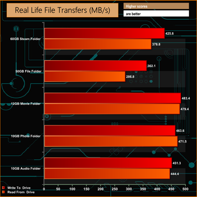 The KC400 dealt with the real life folders without any problems, averaging out across the five folders at 437MB/s for writes and 408MB/s for reads. The performance did fall dramatically, however, when reading back the small bity files contained in the 50GB File folder.