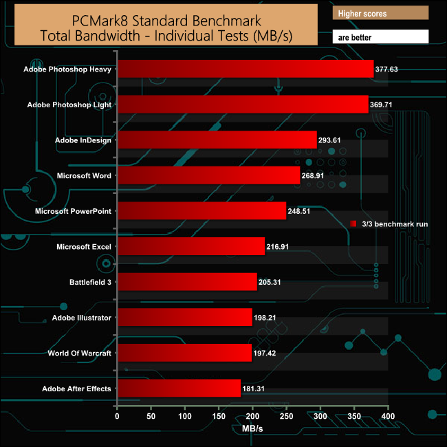 Just like the Consistency test, PCMark 8’s Standard Storage test also saves a large amount of performance data. The default test runs through the test suite of 10 applications three times. Here we show the total bandwidth performance for each of the individual test suites for the third and final benchmark run.