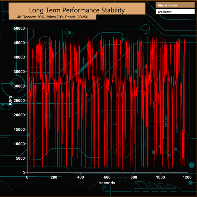 For the long term performance stability test, we set the drive up to run a 20-minute 4K random test with a 30% write, 70% read split, at a Queue Depth of 256 over the entire disk. The 960GB UV500 averaged 31,870 IOPS for the test with a performance stability of 68.45%, which for this class of drive is pretty good.