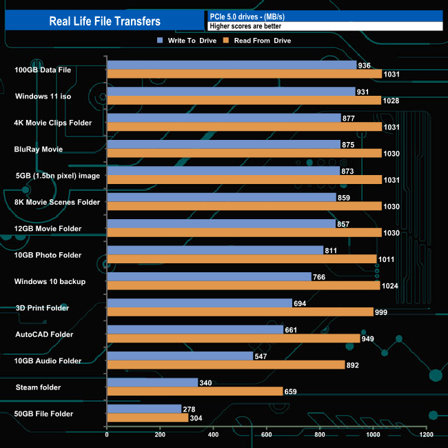 As for reads it averaged 932MB/s with the fastest speed being the 1,031MB/s produced by the 100GB Data file, 4K Movie Clips folder and the 5GB image transfers. The slowest transfer was, as usual in this test the 50GB File folder at 304MB/s for reads and 278MB/s for writes.