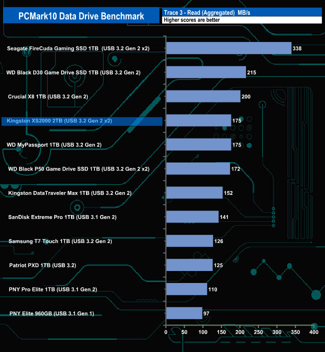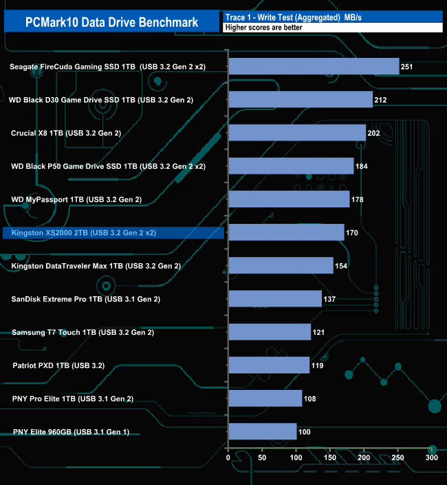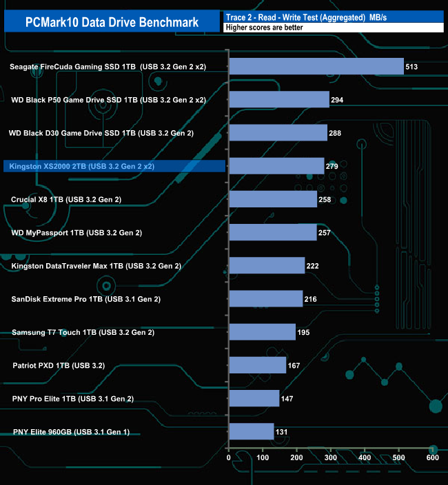 The XS2000 does pretty well in PCMark 10 Data Drive Benchmark sitting in the top half of all the results charts, although it must be said it didn't perform as well in the write trace test as it did in the read and read/write tests.
