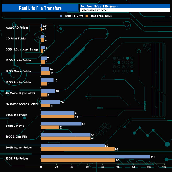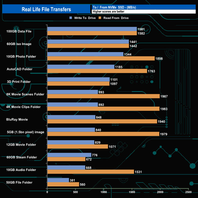 Switching over to transferring the files to and from an NVMe drive saw performance rocket as you might expect particularly read performance. The fastest read bandwidth came from the 5GB image transfer at 1,979MB/s while the fastest write performance, 1,581MB/s, came via the 100GB data file transfer.
