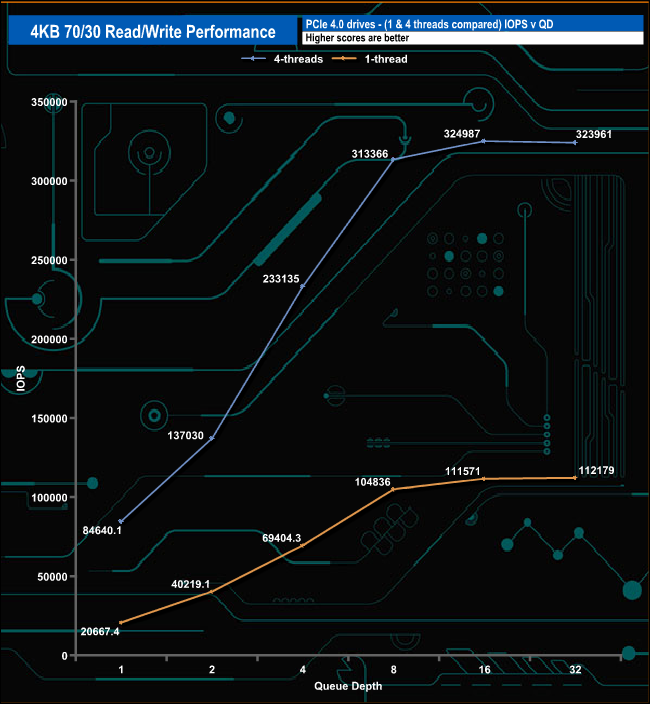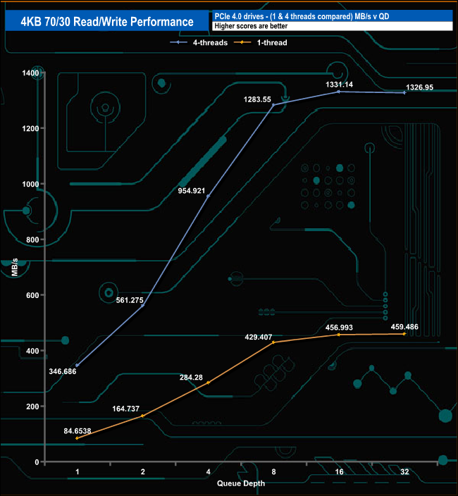 We used CrystalDiskMark 8’s custom settings to test the 4K 70/30 mixed read/write performance of the drive through a range of queue depths using a single thread and four threads.
