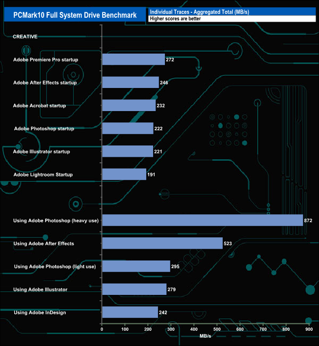 The PCMark 10 Full System Drive Benchmark uses a wide-ranging set of real-world traces from popular applications and common tasks to fully test the performance of the fastest modern drives. The benchmark is designed to measure the performance of fast system drives using the SATA bus at the low end and devices connected via PCI Express at the high end.
