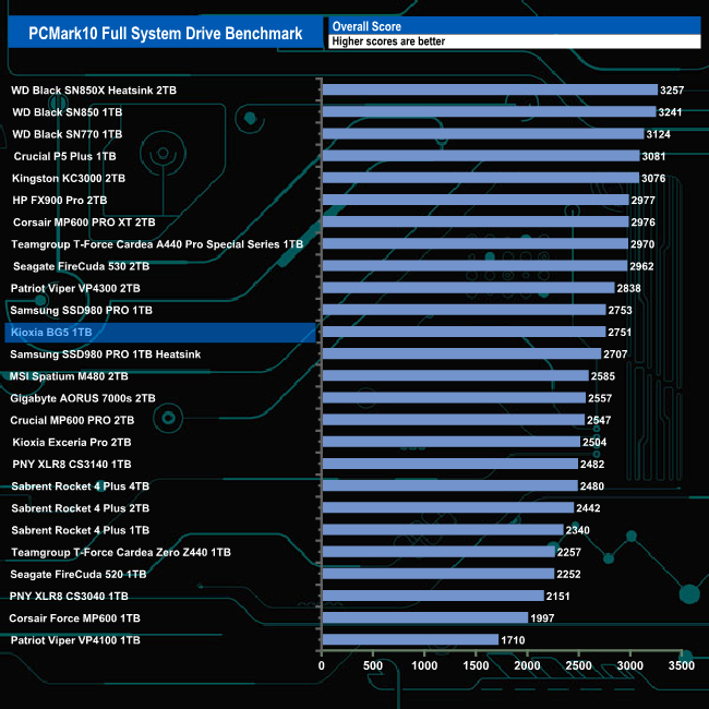 The best result from the 1TB Kioxia BG5 in PCMark10’s Full System Drive Benchmark Adobe test traces was the 872MB/s for the Heavy Use Adobe Photoshop trace while the best result in the gaming test traces was the 756MB/s from the Battlefield V trace. The file transfer tests also produced a good cp1 (write test) figure of 2,554MB/s backed up by the 1,869MB/s for the cp2 read/write and 1,650MB/s for the cp3 (read test) test traces.