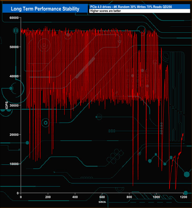 For the long-term performance stability test, we set the drive up to run a 20-minute 4K random test with a 30% write, 70% read split, at a Queue Depth of 256 over the entire disk. The 1TB Kioxia BG5 averaged 41,073 IOPS for the test with performance stability of 73%.